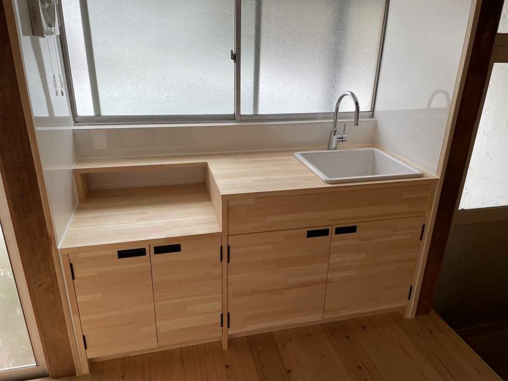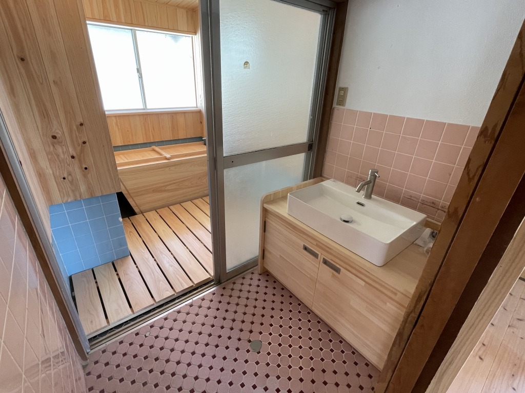 木製のキッチンや洗面台、檜風呂は大工さんの手作り。木の温もりが感じられます。ヒノキ風呂は、有効成分“フィトンチッド”によってリラックス効果や安眠効果が得られる優しいお風呂です。
